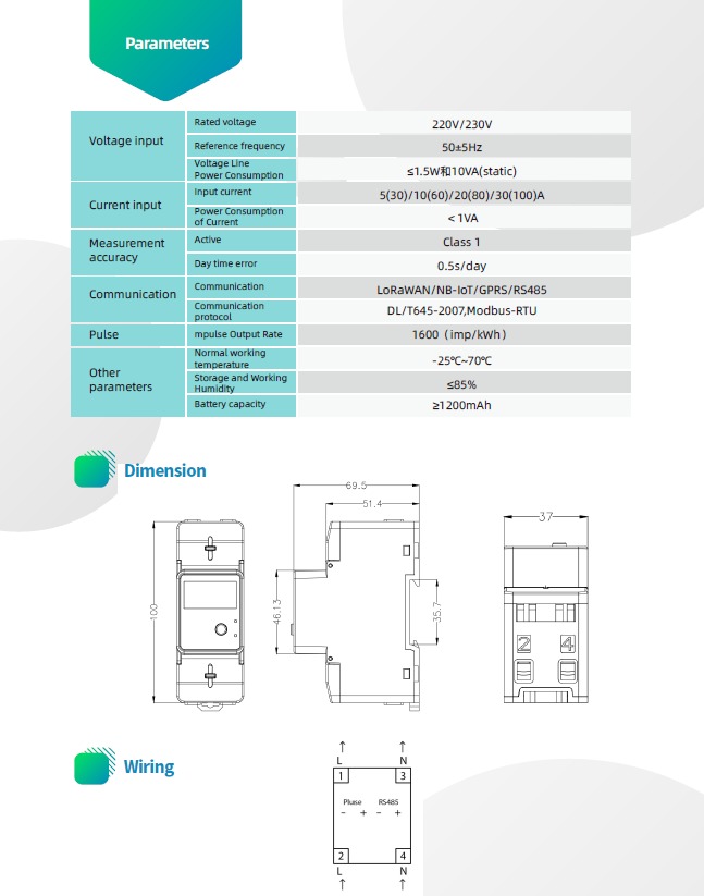 The Zhongyi Smart Single-Phase Din-Rail Energy Meter (DDSUZY2410) is a high-tech device utilizing advanced ultra-low power consumption and SMT technology for precise energy measurement. It offers high accuracy, stability, and reliability, with functions to measure active energy, voltage, current, power factor, and grid frequency. The meter supports remote management via multiple communication protocols, including LoRaWAN, GPRS, 4G, NB-IoT, and RS485. Its LCD display provides real-time power consumption data, while indicator lights show relay status and network connection.